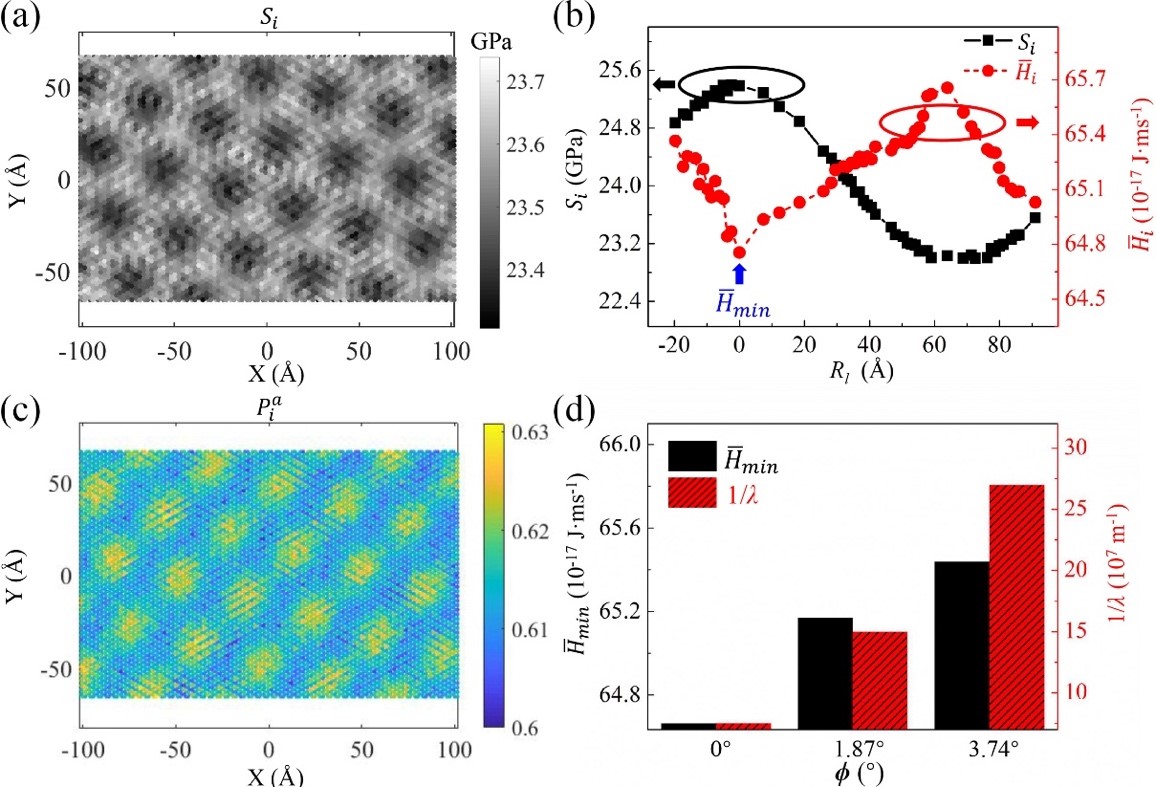 为了阐明小角度层间旋转下莫尔超晶格结构面内热导率的转角依赖特性,同时揭示其与原子应力和结构莫尔图纹间的关系,本工作还从原子热流的角度分析了其中的物理机制。在AA堆垛区域,原子应力幅值为最大值,但原子热流大小的幅值则处于最小值(图1(b))。这表明原子应力与原子热流间具有强烈的相关性,且与结构的周期性密不可分,这直接证实了莫尔超晶格周期性的层间相互作用对面内热输运性质的重要调制能力。