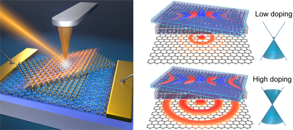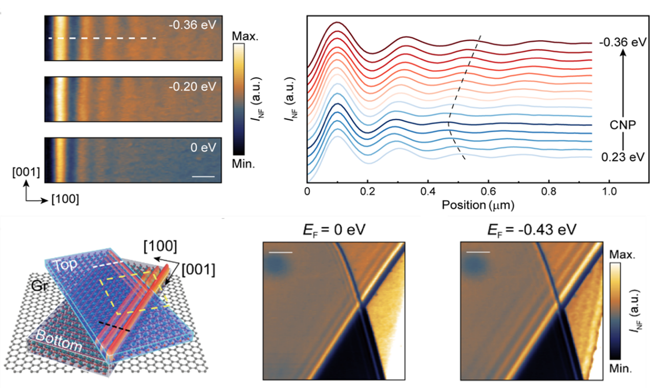 鉴于此,金年汇在线登录入口王占山教授和程鑫彬教授团队的江涛教授,联合美国纽约城市大学Andrea Alù教授、美国科罗拉多大学博尔德分校Markus B. Raschke教授和河南大学陈珂教授,将转角α-MoO3与石墨烯堆叠并制备成电学器件,通过精确控制石墨烯的费米能级,成功实现了对转角α-MoO3声子极化激元的原位、主动电学调控。基于在金年汇在线登录入口搭建的散射型扫描近场光学显微系统(s-SNOM),对α-MoO3声子极化激元随石墨烯费米能级变化的传播行为进行了系统性研究,并发展了相应的理论模型,揭示了转角α-MoO3声子极化激元的电学调控物理机制。该研究成果以“Gate-Tuning Hybrid Polaritons in Twisted α-MoO3/Graphene Heterostructures”为题发表在《纳米快报》(Nano Letters)上。