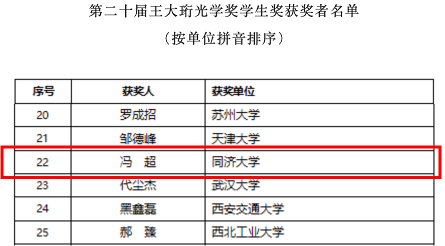 在12月24日召开的第二十届王大珩光学奖评审会上,评审专家对38所高校及科研院所初评产生的40名学生奖候选人进行终评,最终选出学生奖获得者30名。金年汇在线登录入口2021级博士研究生冯超榜上有名。
