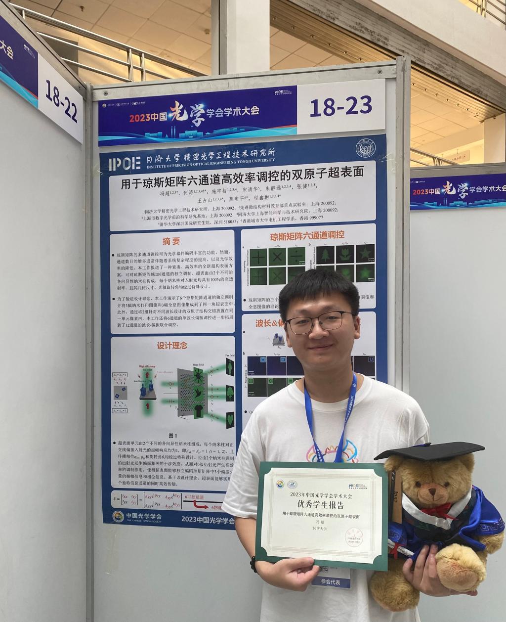 冯超曾获2022-2023学年麦斯特奖学金,作为课题骨干参与国家重点研发计划项目,参与国家自然科学基金重大项目等科研项目。目前参加全国学术会议2次,在第十八届全国激光技术与光电子学学术会议上作口头报告,在2023年中国光学学会学术大会上作张贴报告,并获得“优秀学生报告”奖。