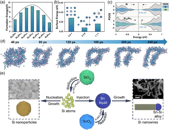 研究基于人工智能结合密度泛函理论(DFT)和分子动力学计算,实现了锡掺杂硅纳米线生长过程的模拟,揭示了锡掺杂硅纳米线的生长机制。在生长过程中氧化锡先被还原成锡液滴,与从二氧化硅(固态)还原出的硅形成液态合金(液态),随着反应的进行,硅在合金液滴中达到过饱和,硅将析出并沿轴向生长,形成纳米线。与之相对比,没有氧化锡参与的二氧化硅还原则形成硅纳米颗粒。因此,区别于经典的硅纳米线VLS生长机制,研究人员提出了一种固—液—固(SLS)纳米线生长新机制。另外硅纳米线中的非平衡掺杂浓度与生长温度和降温速率相关,可进一步通过生长条件来调控。同时,掺杂元素也可拓展到其他低温金属(如Ga,Bi)等,这些结果为研究非平衡掺杂硅材料的物理和化学特性提供了材料基础。该方法还能够拓展到其他IV族元素纳米线的制备,如锗纳米线等。这些纳米线材料也可广泛应用于微电子器件、传感器、光伏器件及其他先进能源存储技术,推动相关领域的发展。