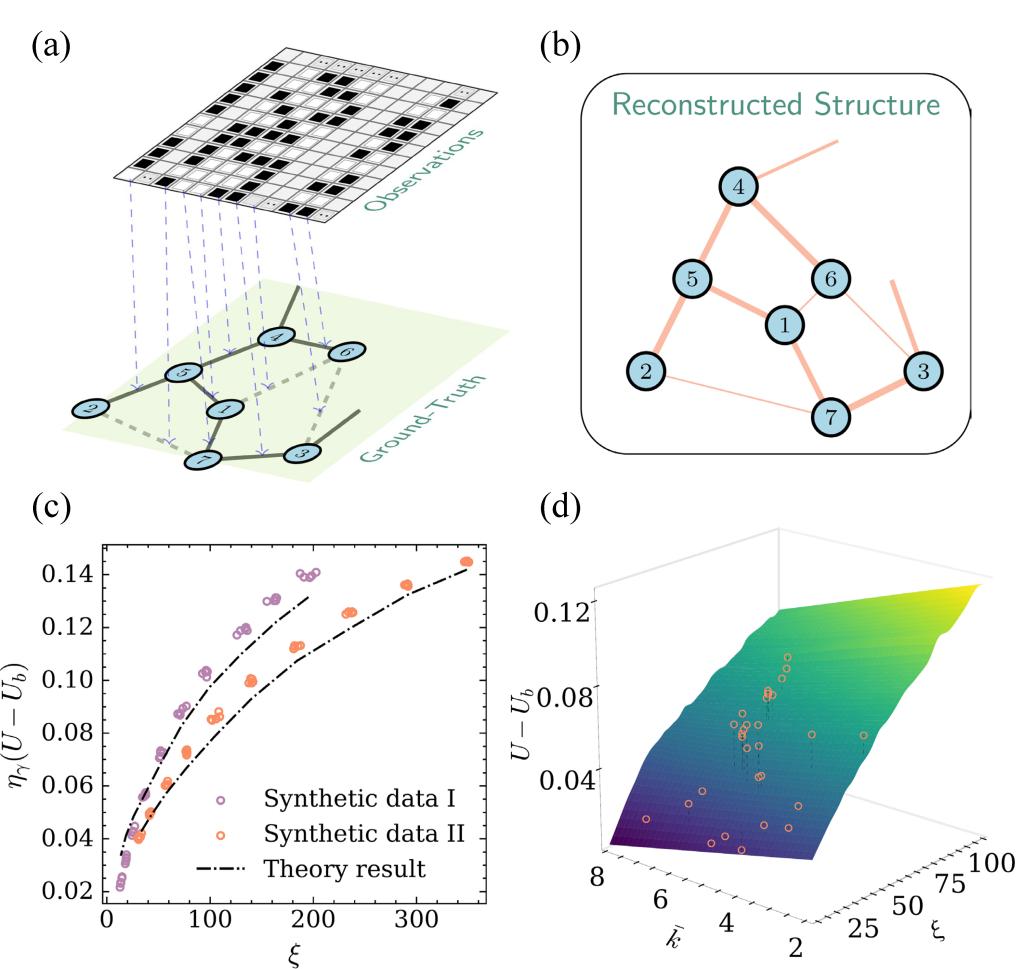 实际复杂系统通常包含大量相互作用的个体,这些个体可以用节点来表示,节点之间通过加权的连边来量化相互作用的强度。然而,很多实际复杂系统中的节点连边是隐藏的,需要从含有噪声和不确定性的观测数据中进行推断(如图1a,b所示)。该任务称为网络重构,是理解复杂系统功能的关键。虽然学界已有统计推断等多种算法用于网络重构,但一个基本问题仍不清楚:某些网络是否本质上比其他网络更容易重构,即隐藏网络的结构性质如何影响其可重构性。
