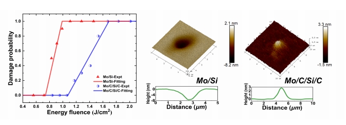 图1、Mo/Si及Mo/C/Si/C多层膜EUV损伤阈值和损伤形貌AFM测试图