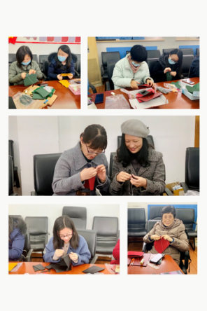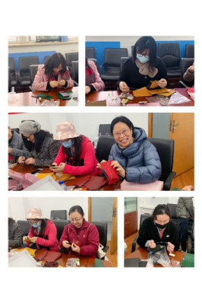 活动现场气氛浓烈,通过视频学习如何穿针引线及缝制手法,初步掌握小方包整体制作方法。女教师们认真操作,相互切磋,虚心请教,其乐融融,趣味无限。经过近三个小时的努力奋斗,由蒋老师制作完成的第一个作品分享在女教师群里,大家纷纷投来羡慕的目光,并表示尽快赶制完成。接着第二个作品,第三个作品陆续完成......