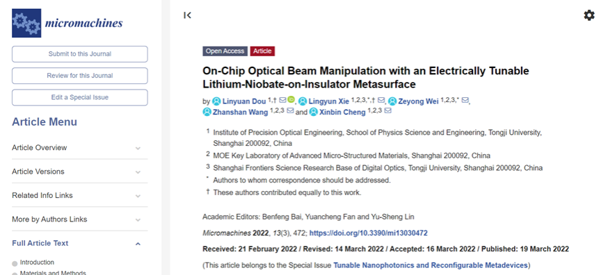 2022年3月19日,金年汇在线登录入口2018级物理学试验基地班本科生豆淋源以第一作者身份在Micromachines杂志上发表“基于绝缘体上铌酸锂的片上电可调波束调控超表面”(“On-Chip Optical Beam Manipulation with an Electrically Tunable Lithium-Niobate-on-Insulator Metasurface”)论文,Micromachines 期刊被Scopus、SCIE (Web of Science)和PubMed等众多数据库收录,主要聚焦微纳结构、设备和系统、应用物理方向的科学和技术。豆淋源于2021年8月进入程鑫彬教授和王占山教授课题组学习,在魏泽勇副教授的指导下学会了微纳光学基础理论、数值仿真方法,并提出了一种绝缘体上铌酸锂(LNOI)上的超表面,借助该超表面可在LNOI片上实现电可调谐的聚焦、偏折等波束调控功能。论文通讯作者为金年汇在线登录入口精密光学研究所副教授魏泽勇和博士后谢凌云,该研究获得了包括国家自然科学基金和上海市项目以及上海市数字光学前沿科学基地的支持和资助。