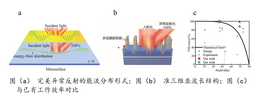针对以上问题,研究团队从完美异常反射的物理要求出发,首先阐明了完美异常反射所需要的能流分布形式,提出了一维多层膜结合二维超表面的准三维亚波长新结构,通过准三维结构内传输波和布洛赫波的高效耦合,增强了多重散射并提高了非局域能流调控能力,在1550纳米实现了国际上效率最高的、效率优于99%的光频异常反射(图)。