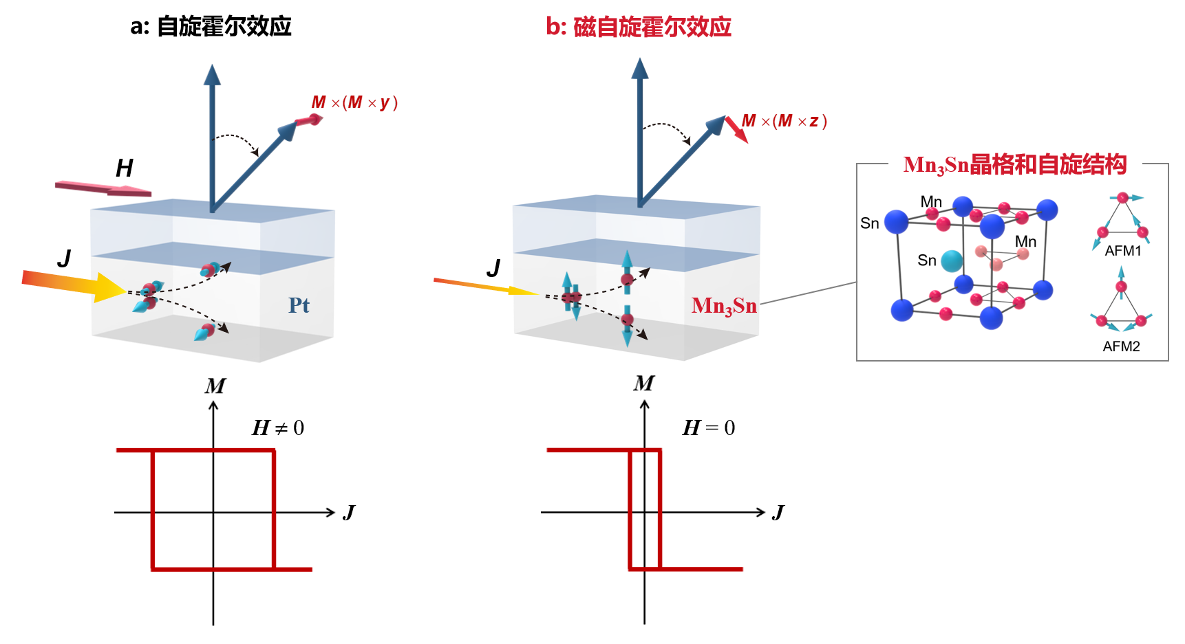 图1:a常规重金属Pt通过自旋霍尔效应产生面内极化自旋流,进而对相邻铁磁层产生自旋轨道矩。这种效应对磁矩的翻转需要较大的电流和辅助磁场。b拓扑非共线反铁磁材料Mn3Sn中通过磁自旋霍尔效应产生面外极化自旋流,进而对相邻铁磁层产生新型自旋轨道矩。 基于这种效应可以在较小的电流下实现磁矩的无场翻转。